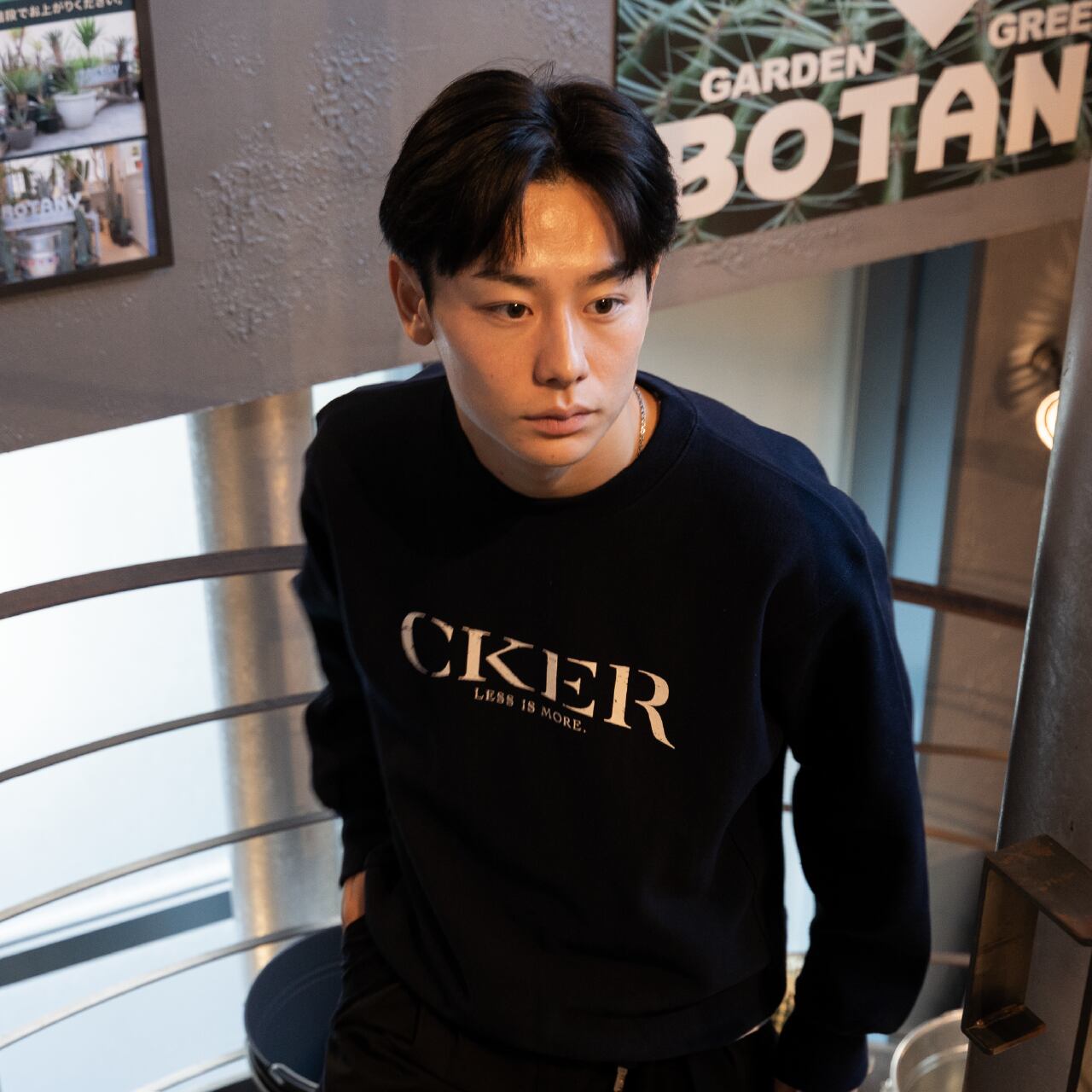 ネイビーにオフホワイトで落とし込んだデザインは、キレイめにもカジュアルにも合わせられる万能スウェットに。